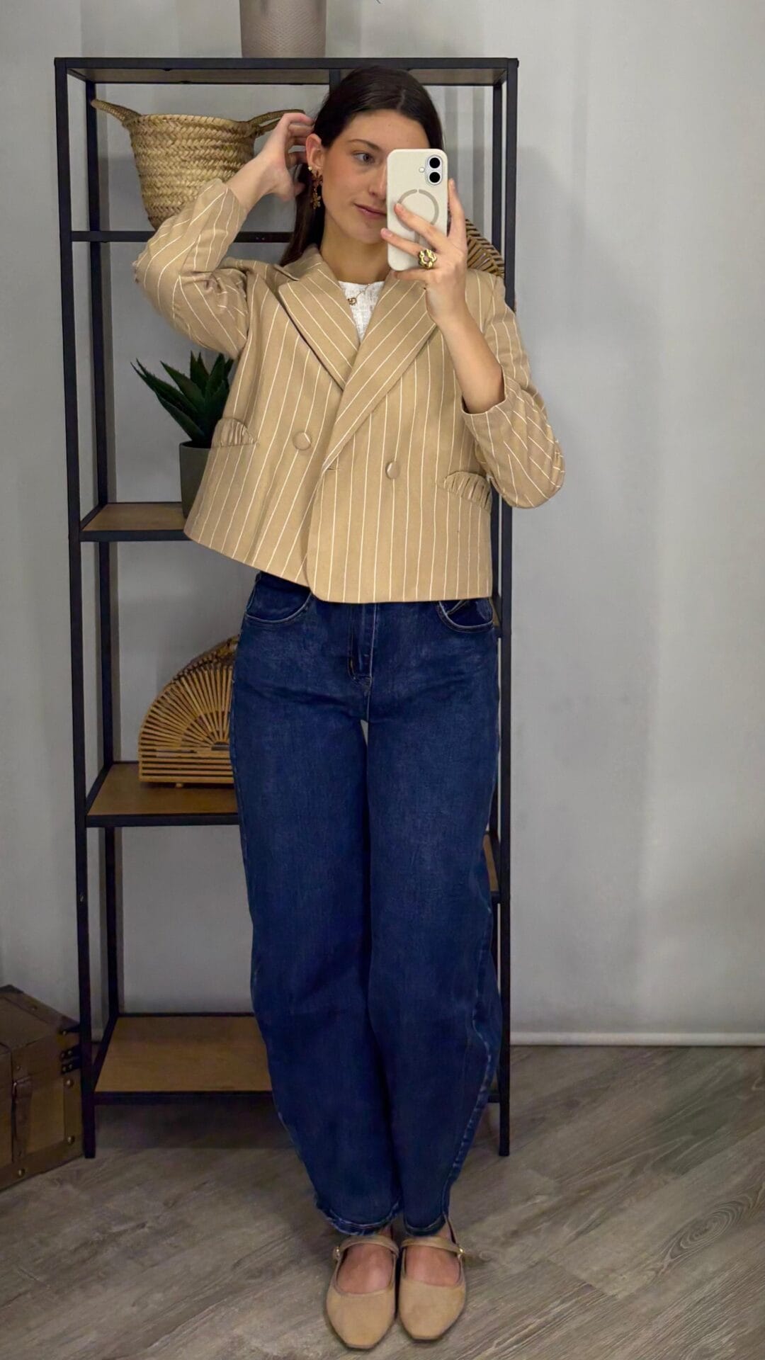 Blazer corta beige con rayas blancas verticales, cierre cruzado y bolsillos decorativos.