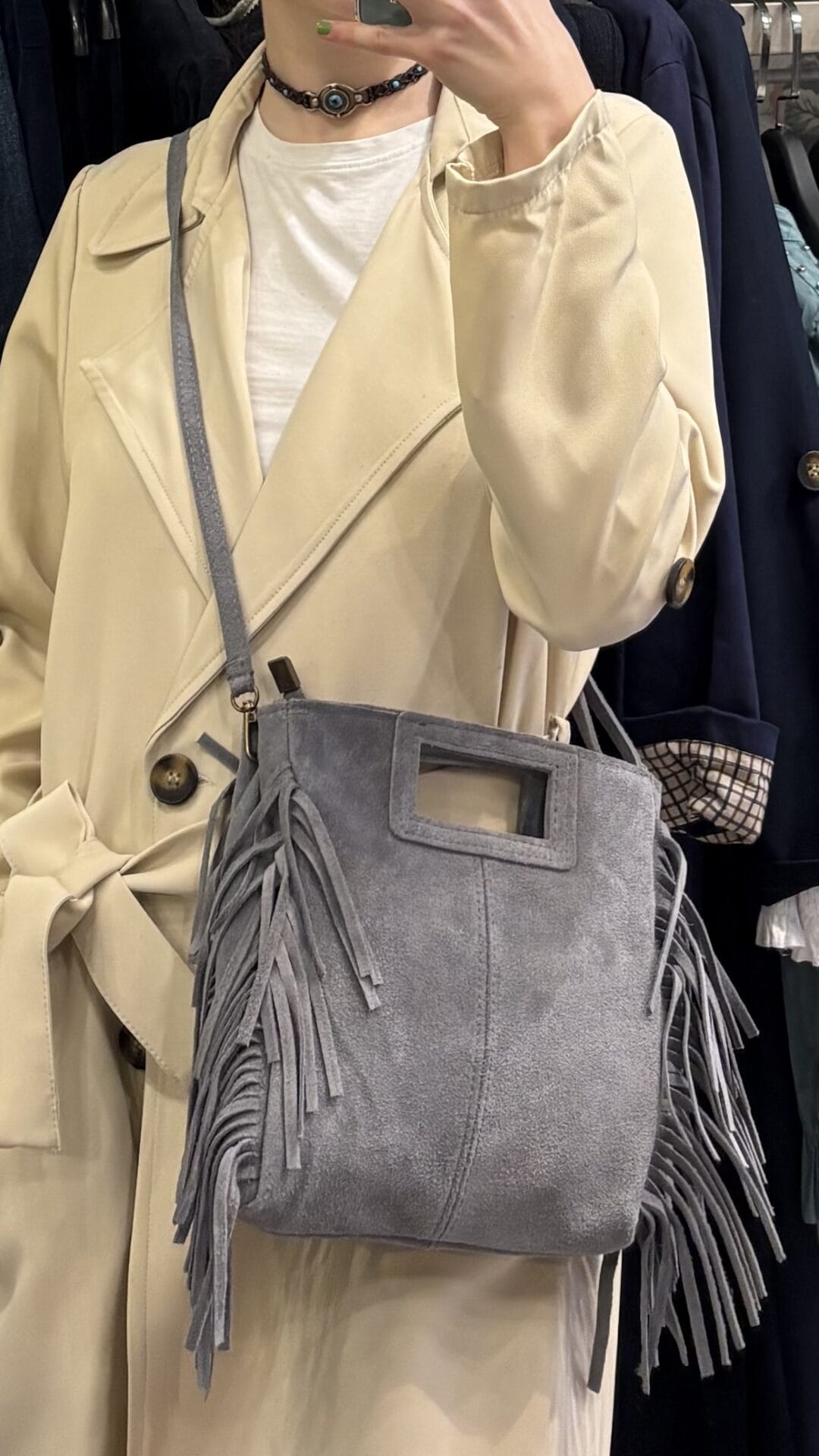 Bolso de piel color gris perla con flecos y asa de bandolera y de mano.