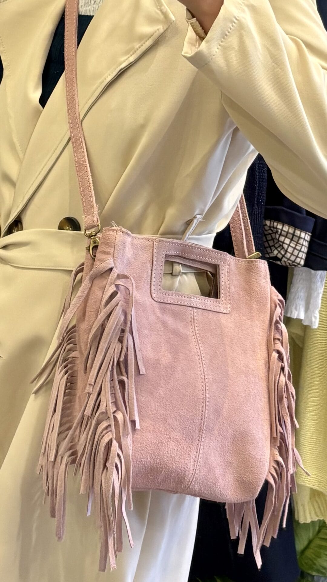 Bolso de piel color rosa clarito, con flecos, asa de bandolera y de mano.