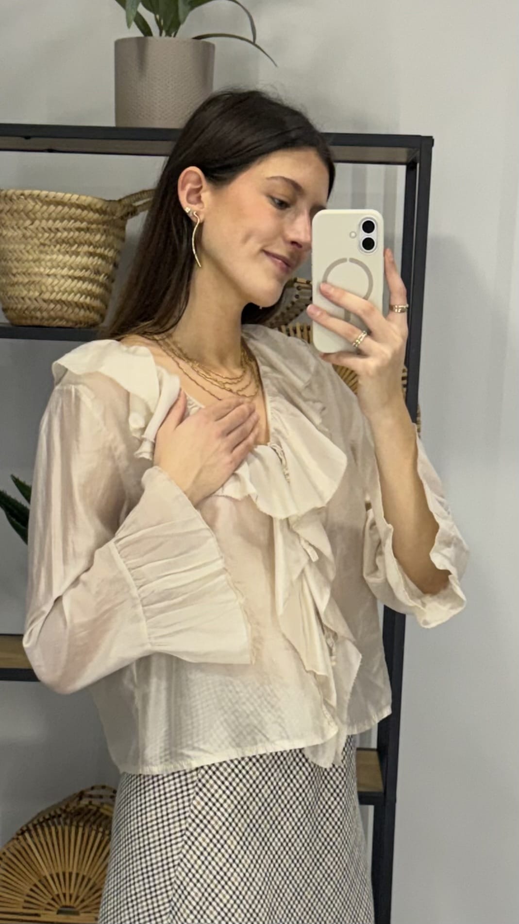Camisa vaporosa color marfil con volantes.