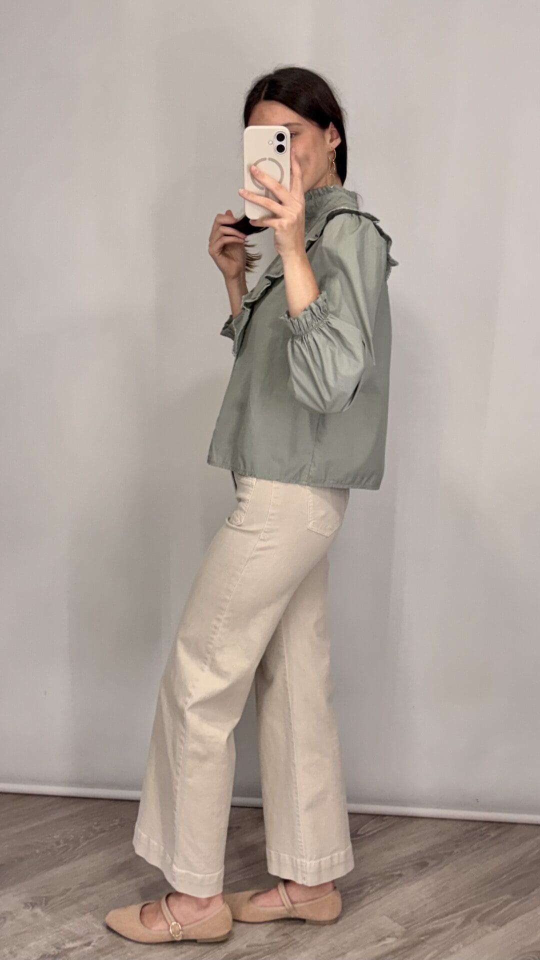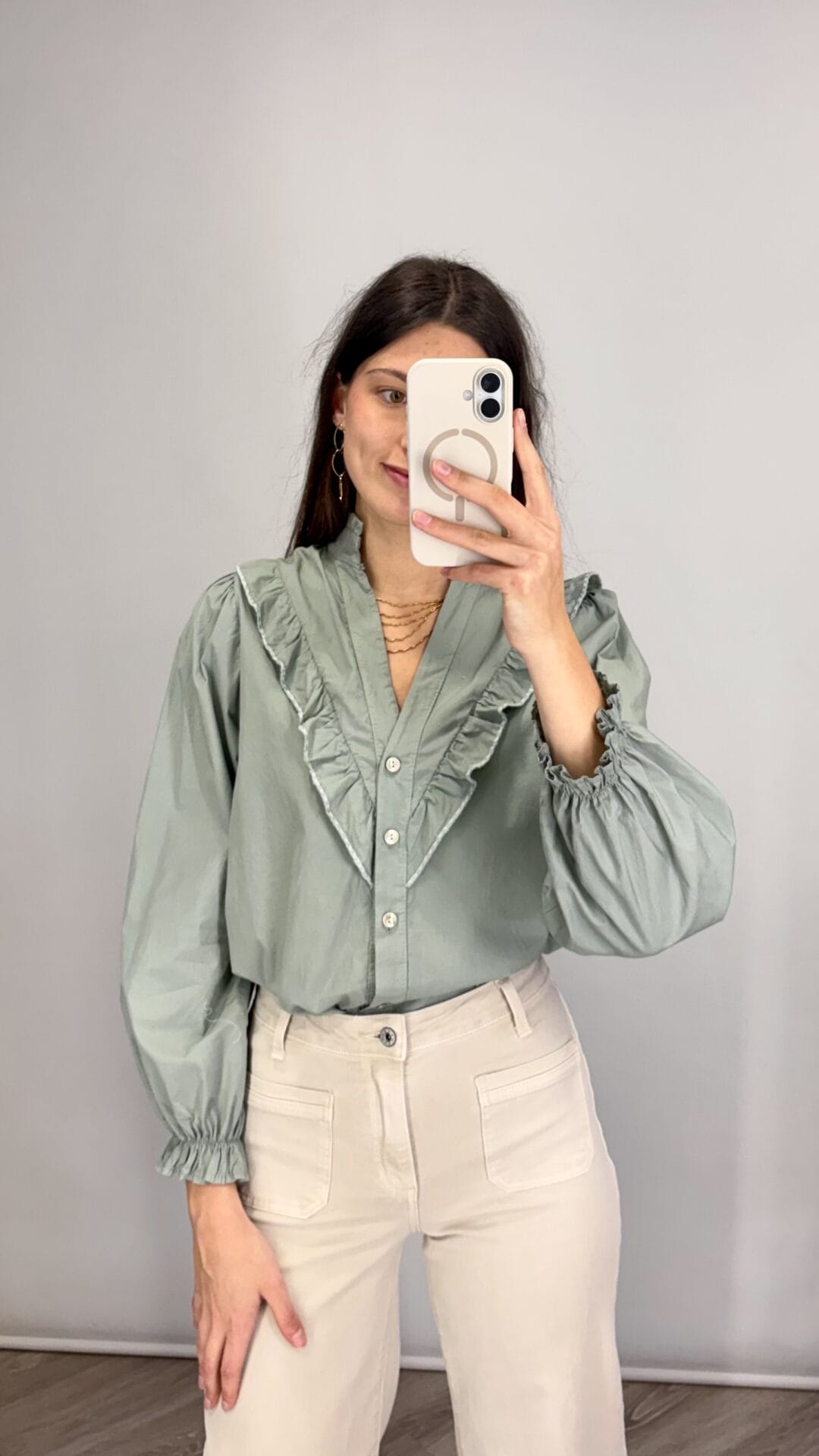 Camisa verde menta con escote de pico y volantes.