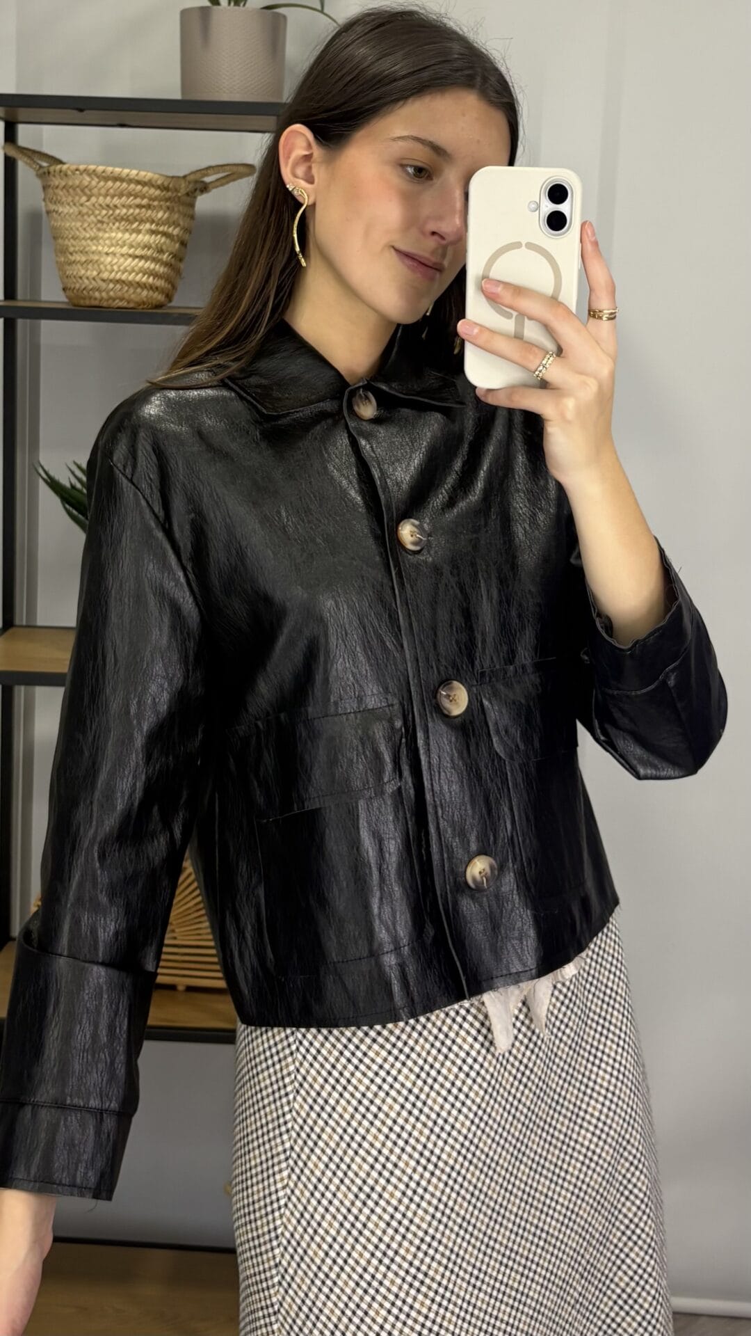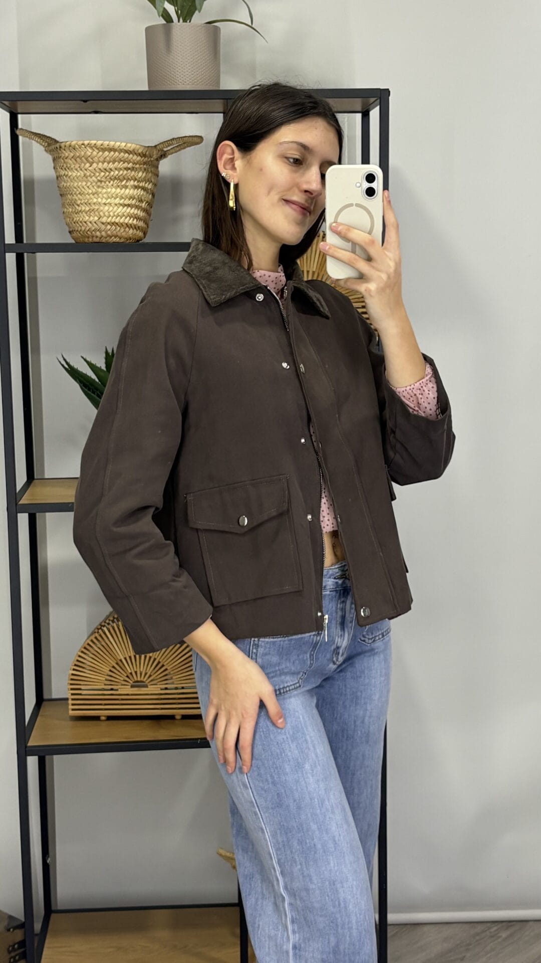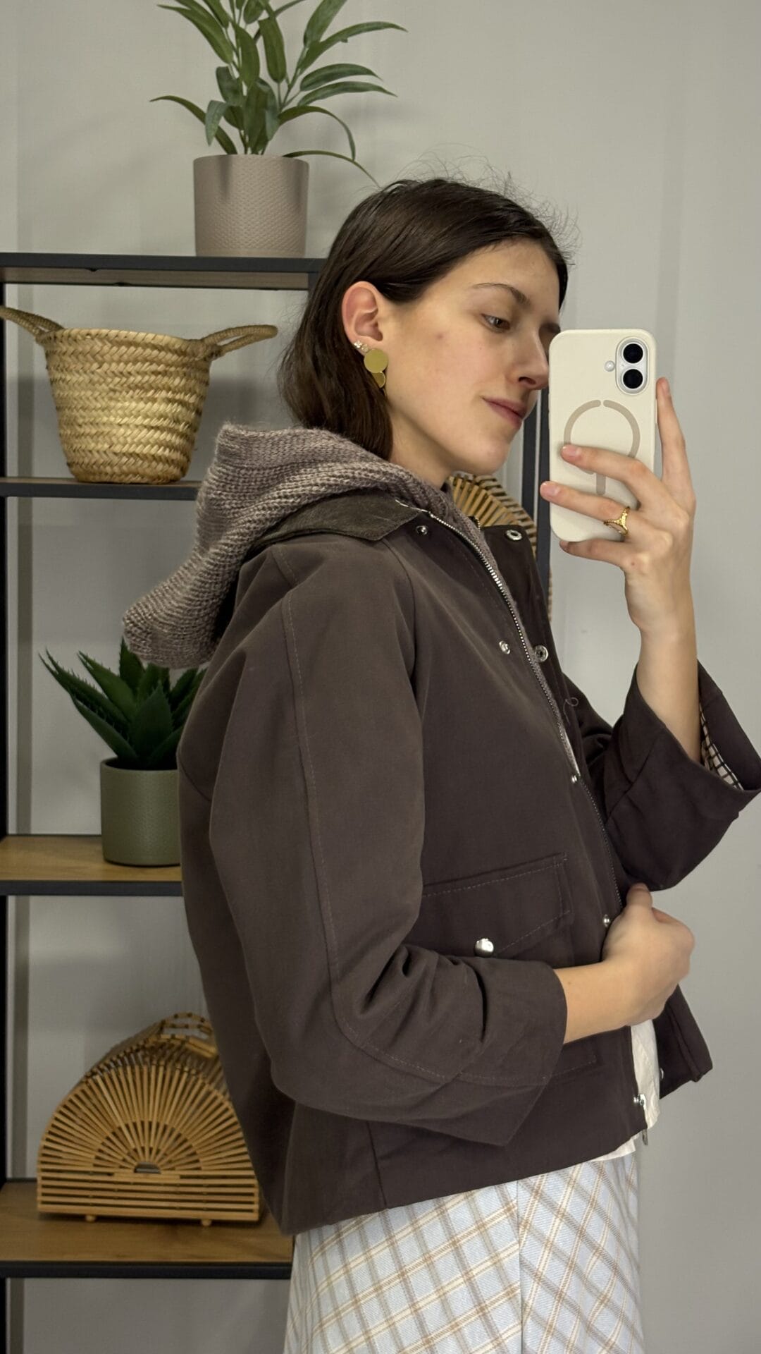 Chaqueta marrón con forro de cuadritos bicolor, cremallera y botones.