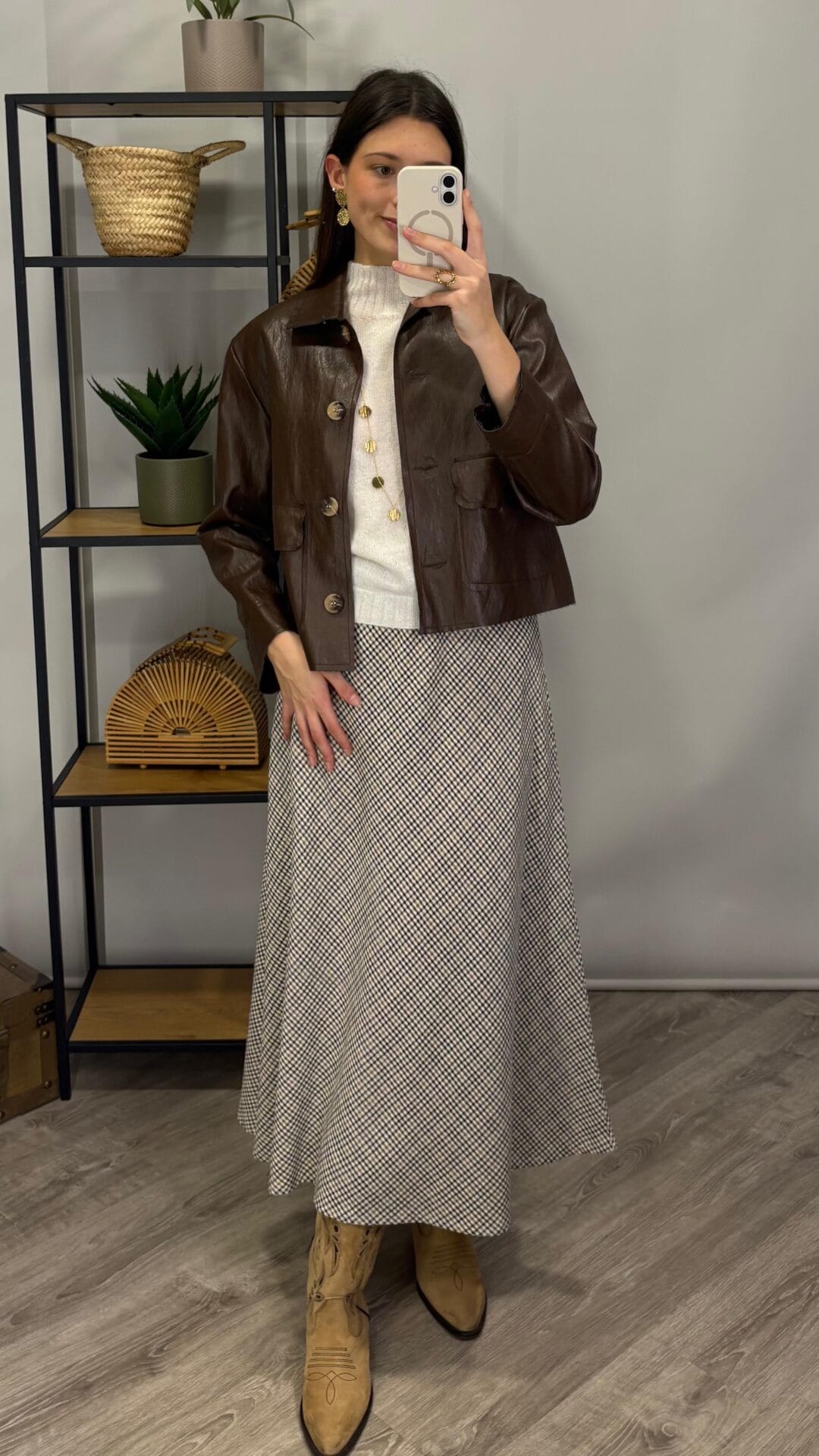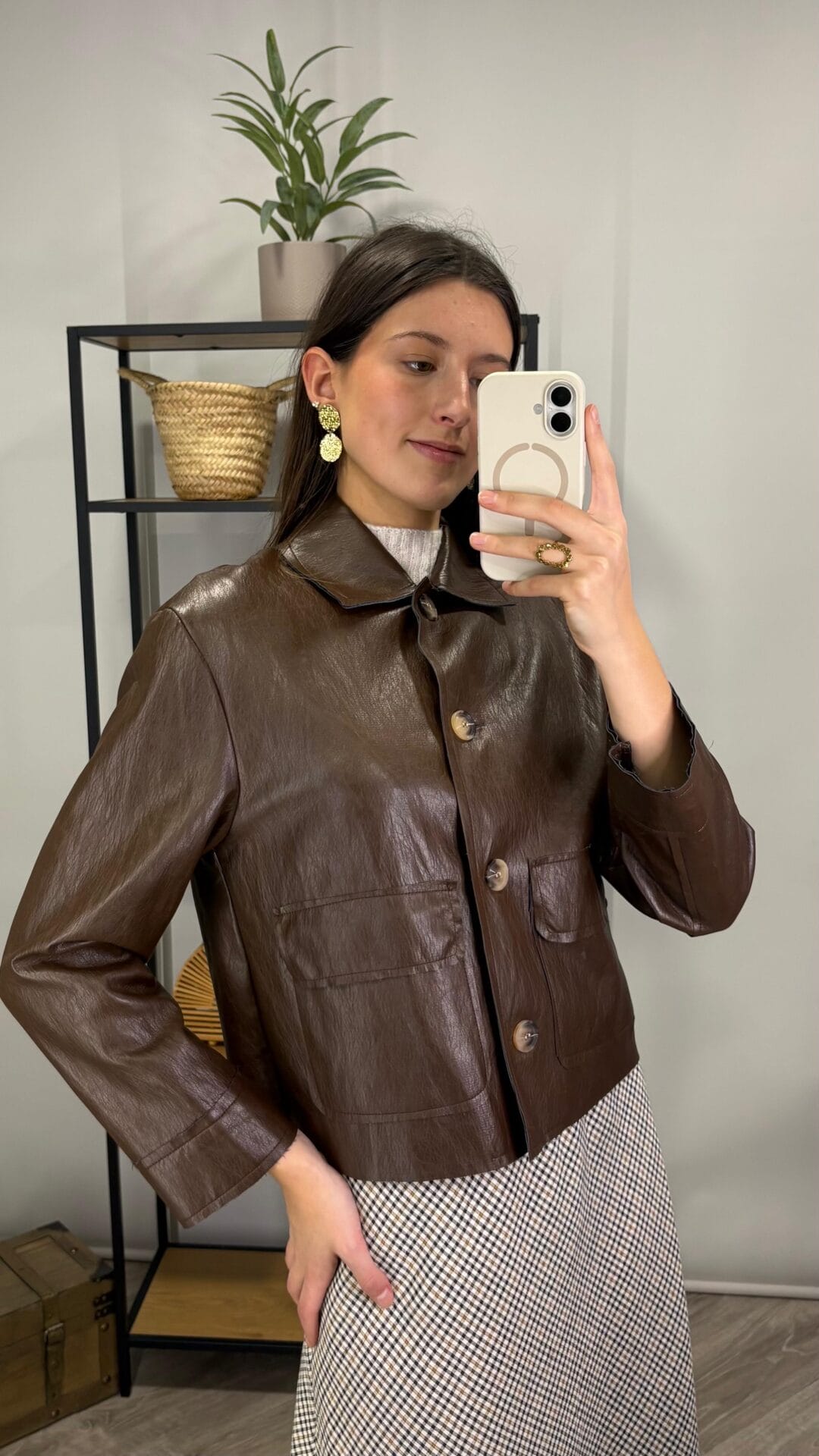 Chaqueta marrón efecto piel con botones.