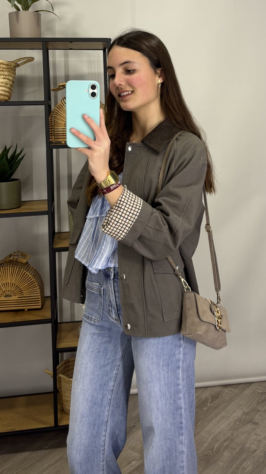 Chaqueta gris con cuello marrón y forro en cuadritos bicolor, con botones y cremallera.