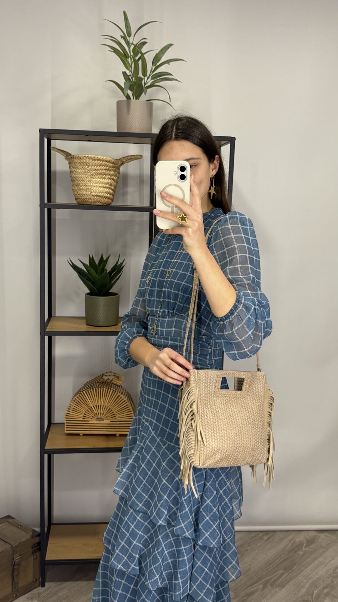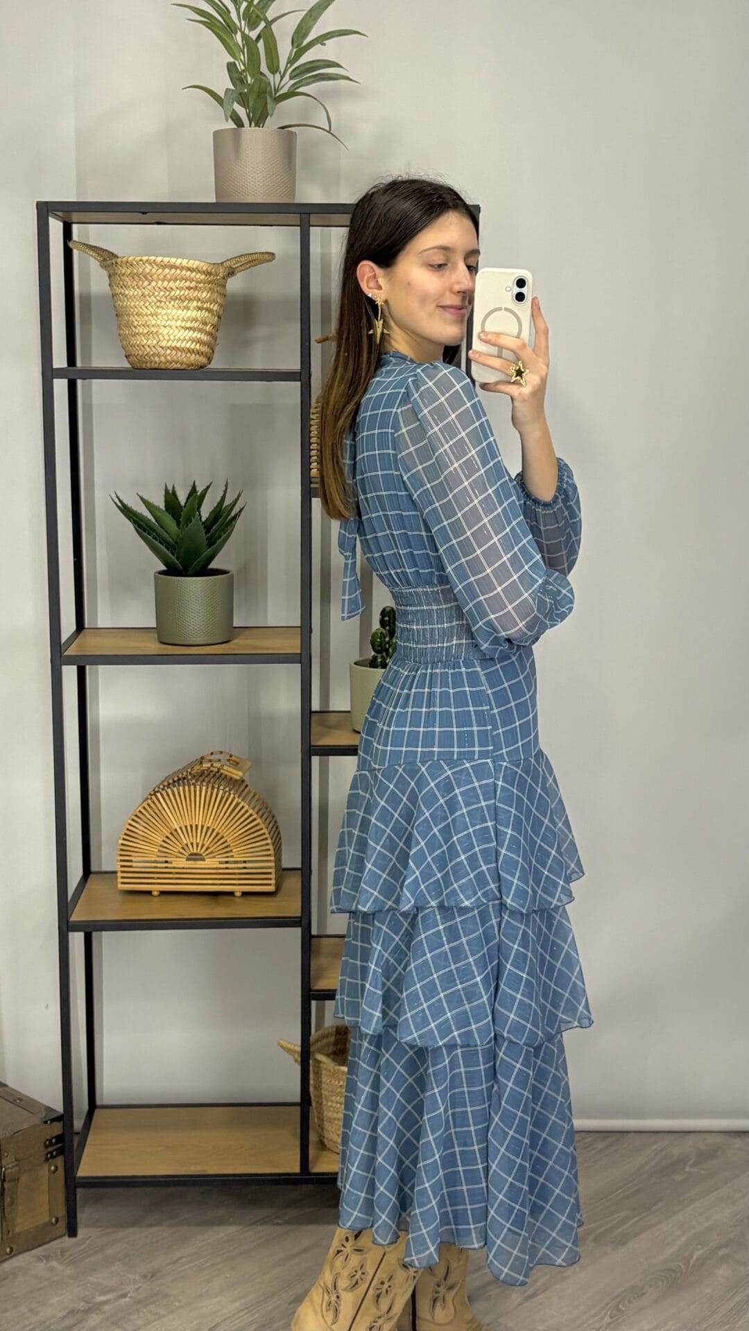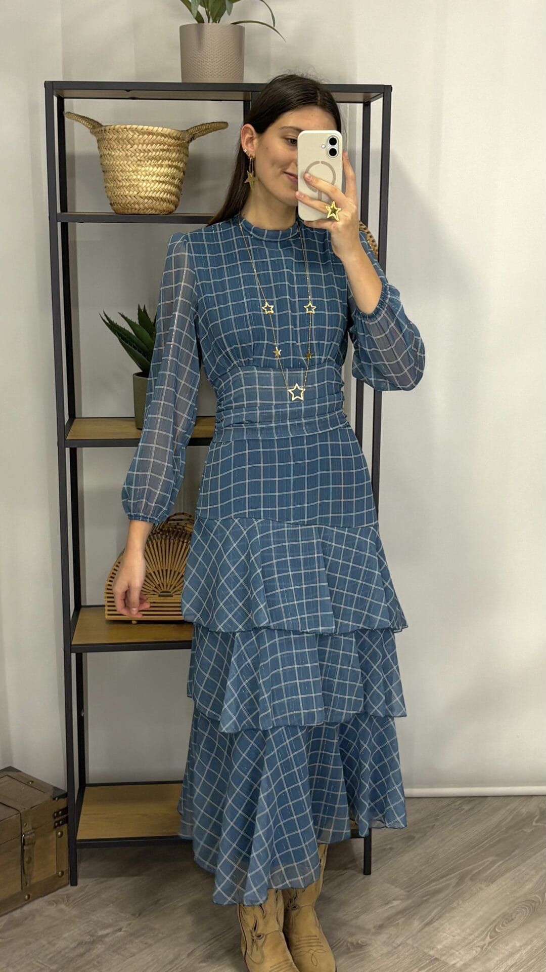 Vestido largo azul con estampado de cuadros, de manga larga y corte entallado en la cintura. Tiene falda fluida con volantes.